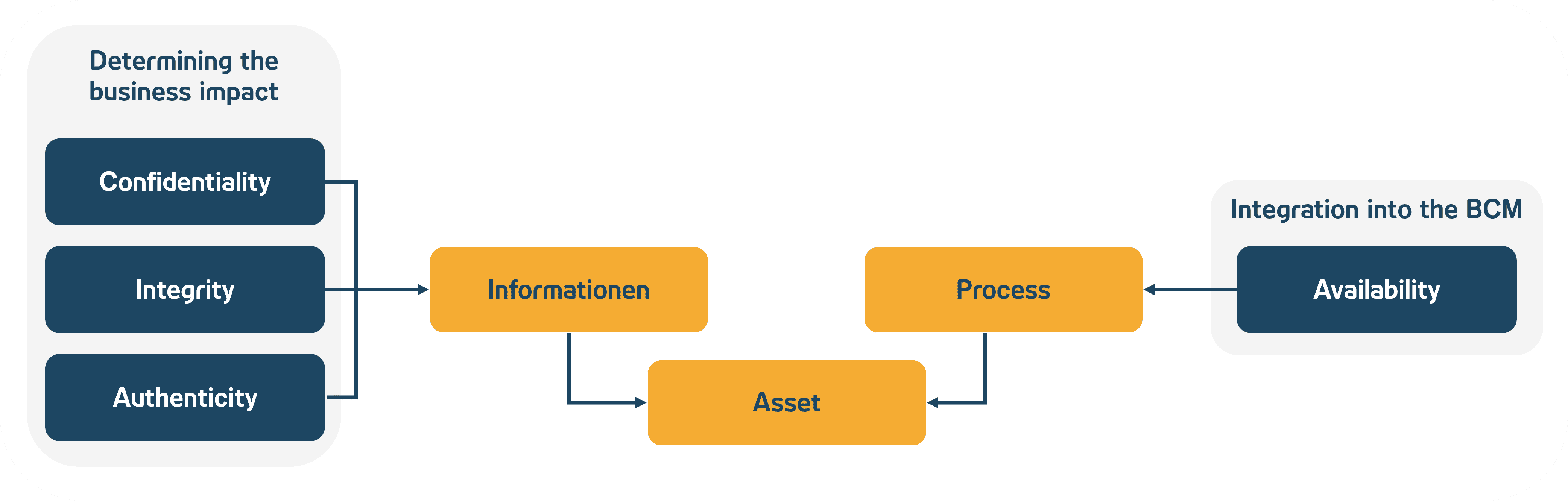 The protection requirements for the assets should be derived from the information objects (based on the protection objectives of confidentiality, integrity and authenticity) and the processes (based on the protection objective of availability). This can be based on the risk matrix and the risk categories defined there for central risk management.