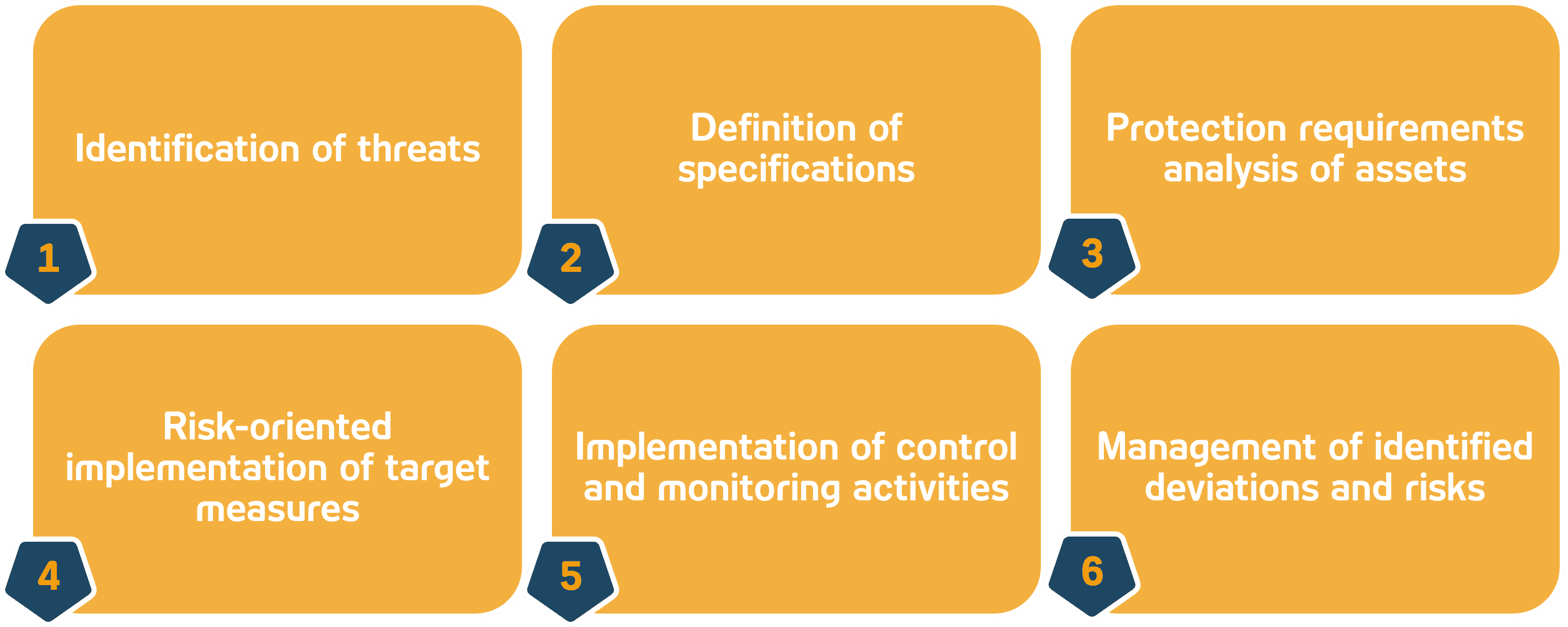 To protect against identified threats, specifications are defined for the various assets of the company, which form the catalog of target measures, such as is also required in the XAIT. At the same time, the information network is created, which forms the sum of all the company’s assets (e.g. information objects, processes, applications, IT systems and service providers) and maps their relationships and interdependencies. Using the information network and the relationships between the assets, the protection requirements of the assets can be determined based on the information and processes and the necessary measures can be implemented. These activities should be checked for completeness, effectiveness, appropriateness and timeliness, e.g. by means of a risk assessment are reviewed regularly and on an ad hoc basis as part of a target/actual comparison. The findings from the analysis of threats, the protection requirements of the assets and the implementation of control and monitoring activities are bundled in a holistic information risk management system and used in the risk assessment.